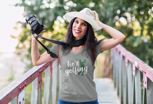 Funny Golf V-Neck Tee — "My Husband Plays Golf Too Much"